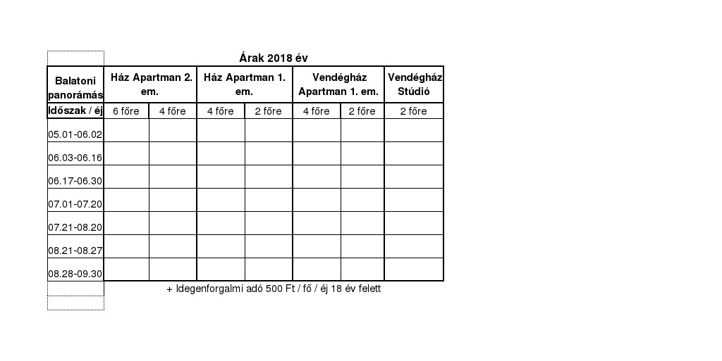 Idegenforgalmi adó (IFA): 18 év felett 530 Ft/Fő/ Nap